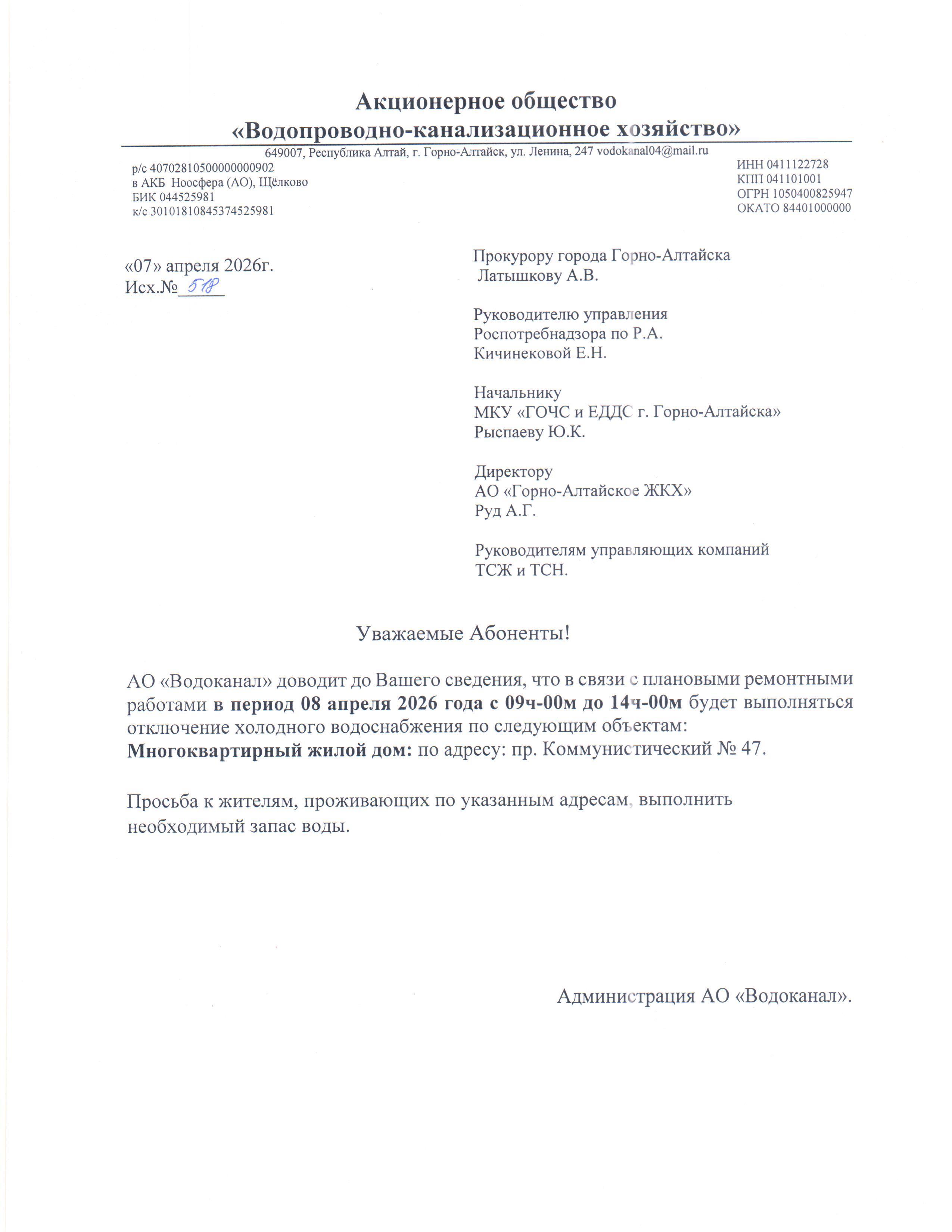 Отключение холодного водоснабжения 8 Апреля 2026 года